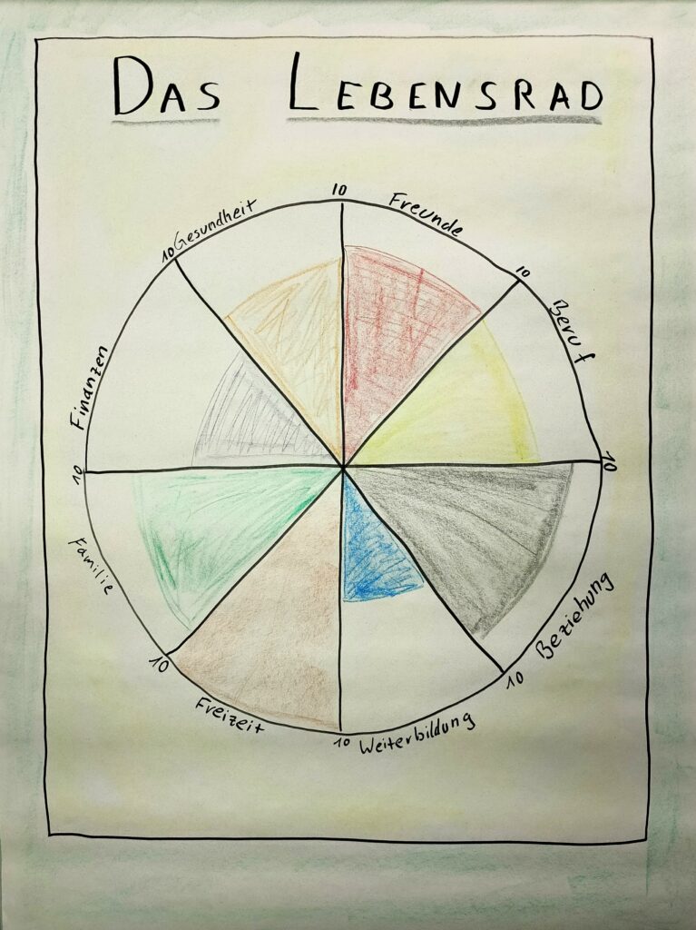 Achtung: Das Lebensrad ist eine Methode aus dem Coaching. Es ist sehr mächtig und kann zur Selbstreflexion eingesetzt werden. Wie viele andere Methoden auch, entfaltet es sein Wirkung am besten, wenn es im Rahmen einer Coachingsitzung oder zumindest unter Begleitung eingesetzt wird.